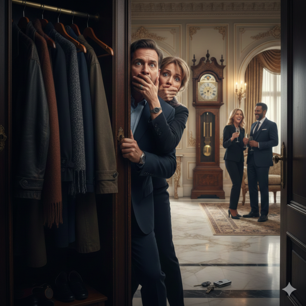 Michael, atrapado entre abrigos caros, escuchó cómo los pasos se detenían frente al armario… y, de pronto, un estruendo en otra parte de la casa, como una pila de cajas desplomándose.