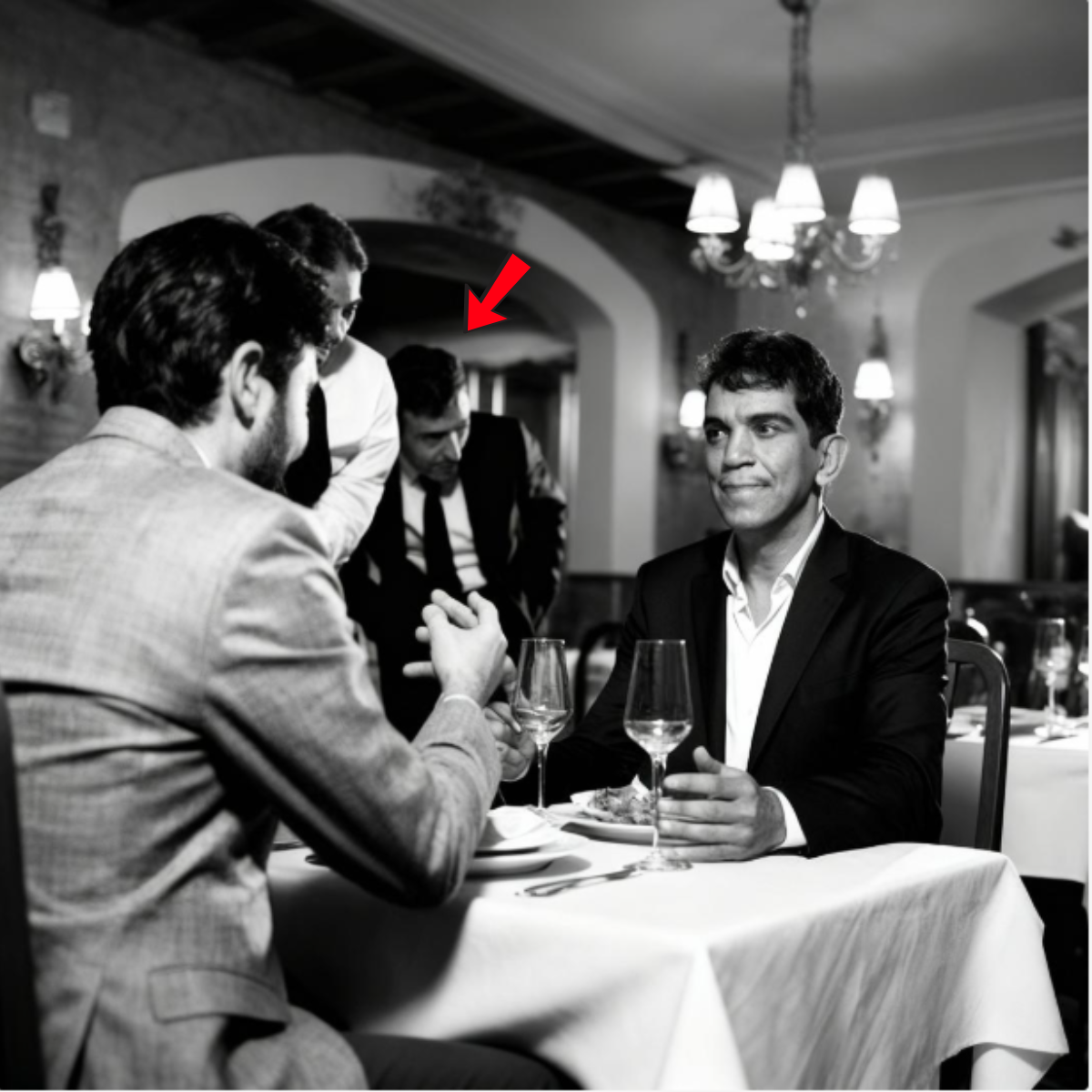 Jorge y los meseros estaban listos para actuar, esperando solo la señal de Mario. El hombre borracho miró alrededor del restaurante. Vio a todos mirándolo. Vio a sus propios amigos en su mesa luciendo avergonzados. Vio a Jorge y los meseros esperando para sacarlo.