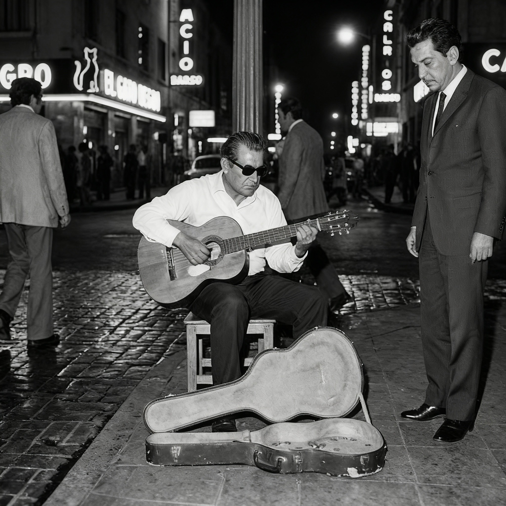 Pero lo que inmediatamente capturó la atención de Mario fue que el hombre era ciego. Usaba gafas oscuras a pesar de que era de noche. Su cabeza se inclinaba ligeramente hacia la guitarra mientras tocaba, sus dedos moviéndose con precisión increíble a lo largo del mástil.