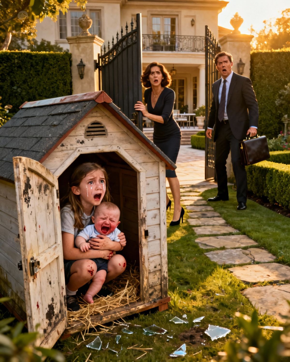 Sin darle tiempo a reaccionar, arrastró a ambos por el pasillo. Emma lloraba en silencio, protegiendo la cabeza de su hermano mientras caminaban hacia la puerta trasera. La noche era húmeda. El viejo cobertizo del perro, abandonado desde hacía años, se alzaba oscuro al fondo del jardín.