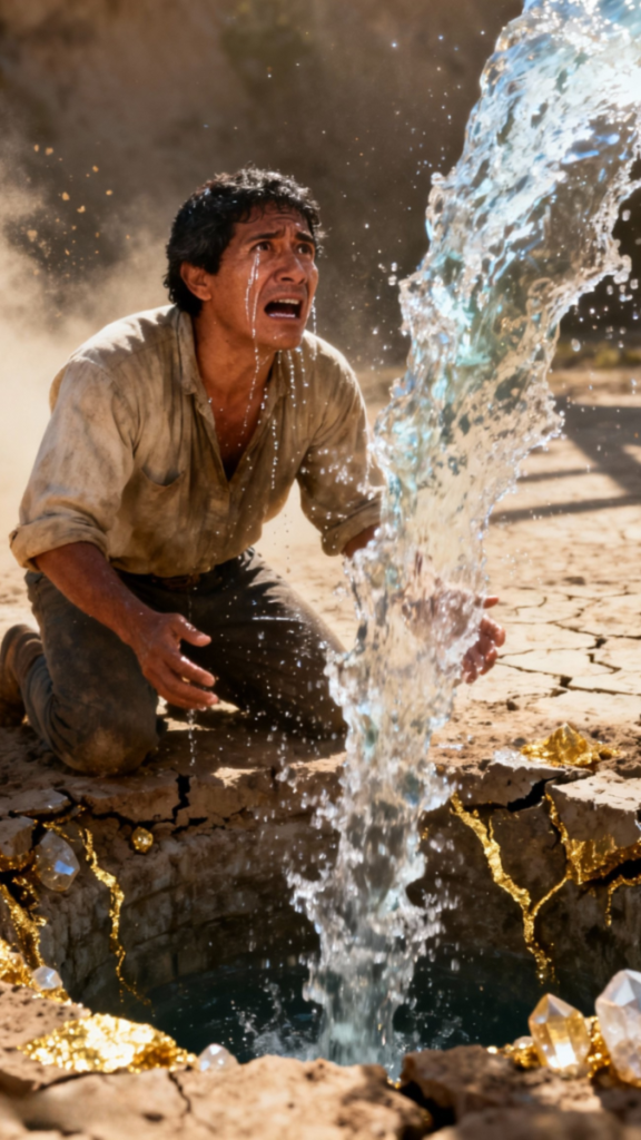 De repente, un chorro de agua cristalina y fresca brotó con una fuerza descomunal, empujando a Mateo hacia arriba. No era un pozo seco; era la entrada a un acuífero subterráneo virgen que la sequía no había podido tocar, protegido por una barrera de roca mineralizada. Mateo salió del pozo empapado, gritando de alegría, mientras el agua bendita inundaba la tierra seca y el oro brillaba bajo el sol mexicano.