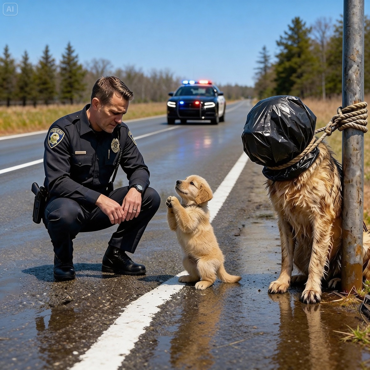 El cachorro regresó corriendo, agarró con los dientes el bajo de mi pantalón de uniforme y tiró. No era agresivo; estaba aterrorizado. Soltó y volvió a correr hacia el callejón, lanzando un aullido que sonó más como un llanto humano.