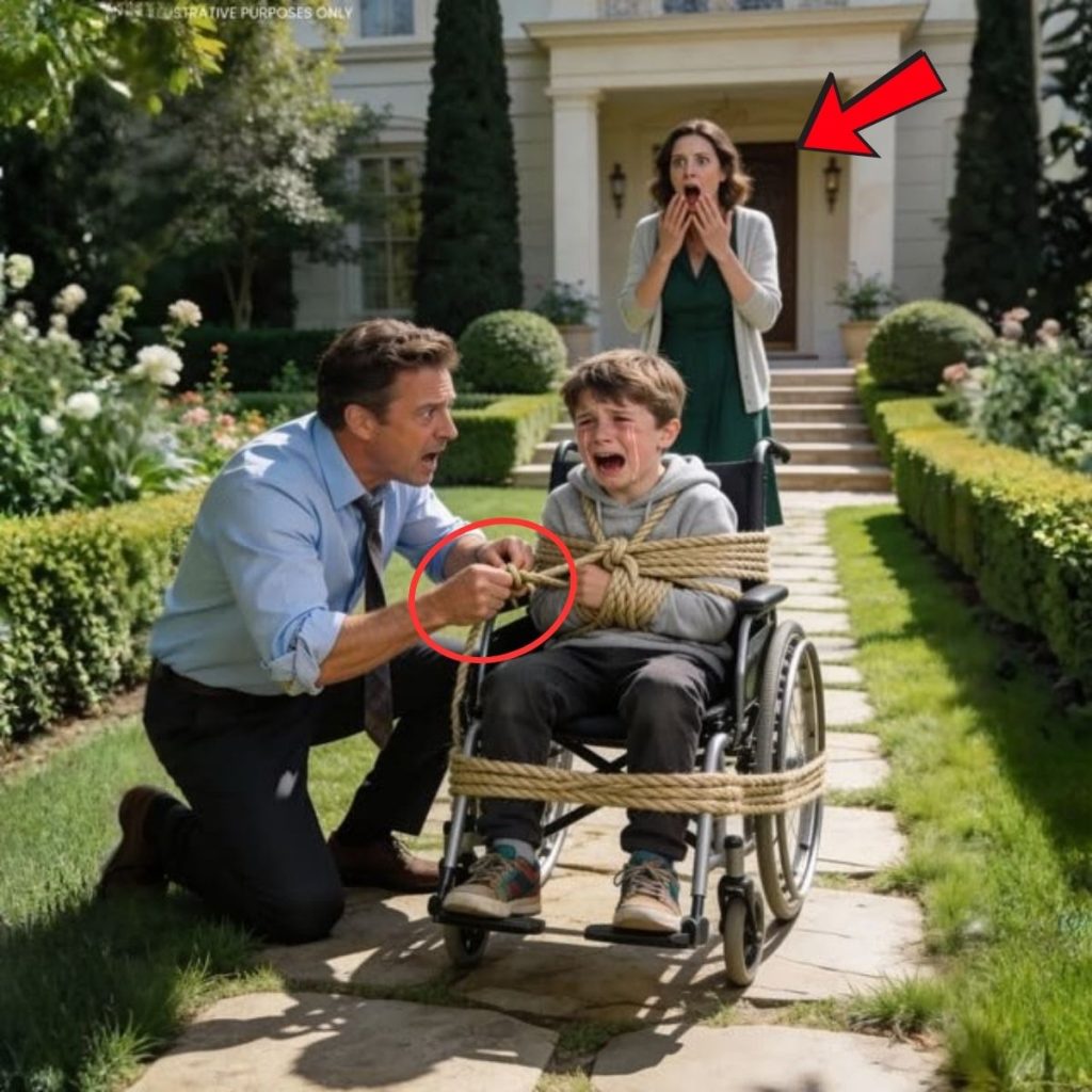 Reese estaba sentado en su silla de ruedas personalizada bajo el árbol de jacarandá, con flores violetas cayendo a su alrededor como una nevada trágica. Una cuerda de nailon le cruzaba el torso y los brazos. Sus manos temblaban, sujetas por otra cuerda enrollada alrededor de los soportes metálicos de la silla. Los tobillos estaban amarrados con tanta fuerza que Calvin podía ver un aro rojo en su piel.