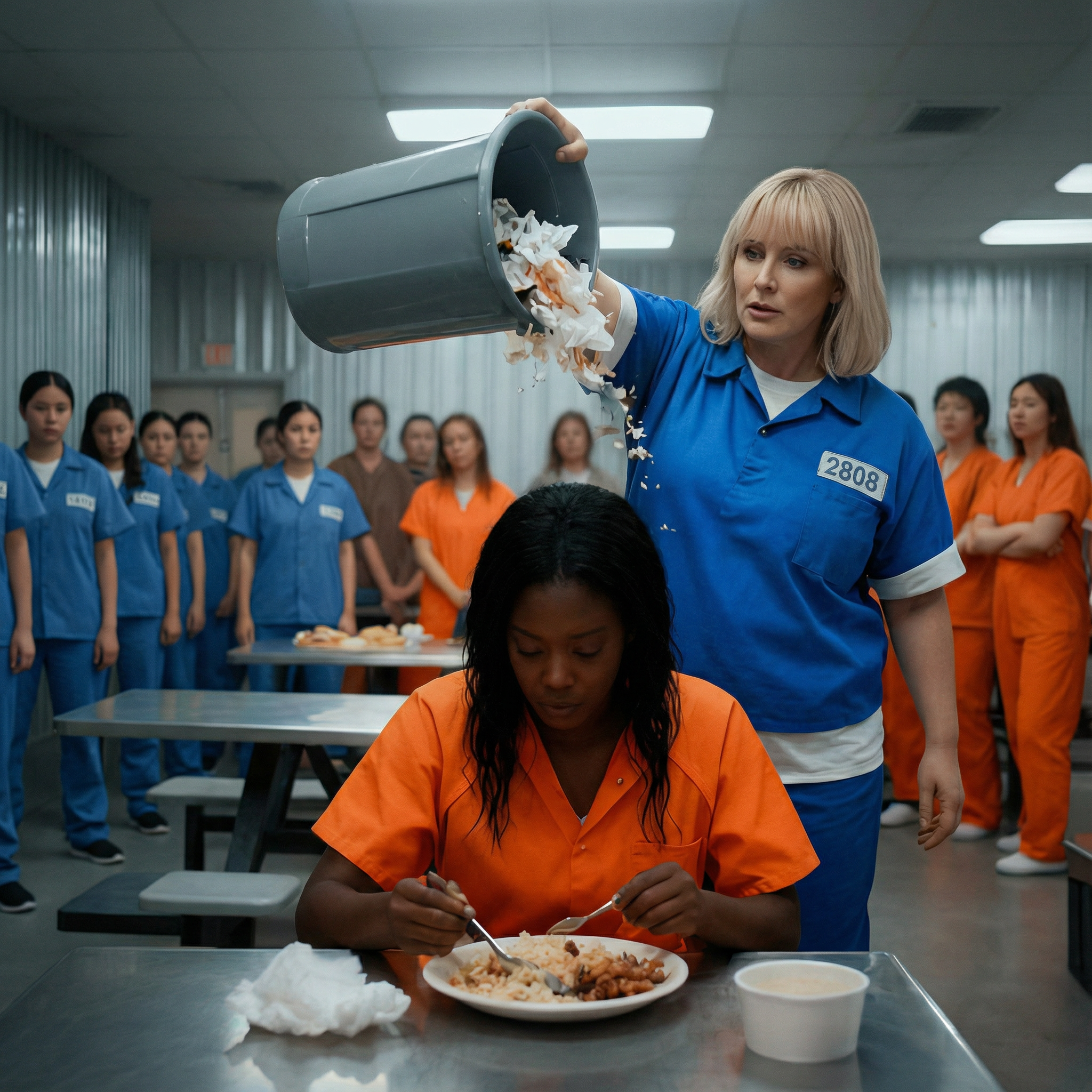 Harper se acercó con lentitud deliberada, saboreando la atención que su movimiento estaba generando en toda la cafetería. Cada ojo estaba puesto en ella. Cada conversación se había detenido. Cada reclusa esperaba ver qué sucedería a continuación. Este era su escenario, su momento para recordar a todas por qué era temida. Maya miró el desastre que cubría su bandeja, luego volvió a mirar a Harper con una expresión que nunca cambió. El silencio se estiró como un alambre demasiado tenso.
