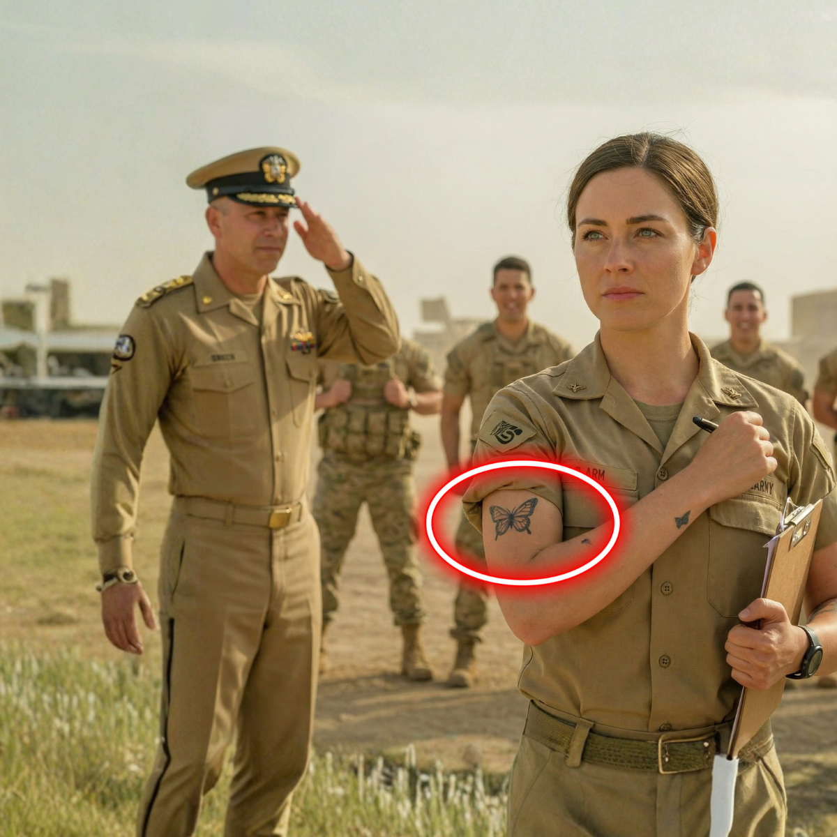 La segunda pista yacía en su tatuaje mismo. Bajo las duras luces del parque móvil, la tinta de la mariposa revelaba más que alas. Líneas finas cortaban a través del diseño, apenas visibles, tejiendo números en el patrón. Coordenadas, dígitos de unidad, algo preciso, oculto a plena vista. Los soldados que se reían de ella nunca lo notaron, pero un SEAL visitante apoyado contra un Humvee lo captó una noche. Su mirada se demoró. Su expresión cambió. No dijo una palabra, pero cuando Emily notó sus ojos en su brazo, se bajó la manga sin hacer ruido.