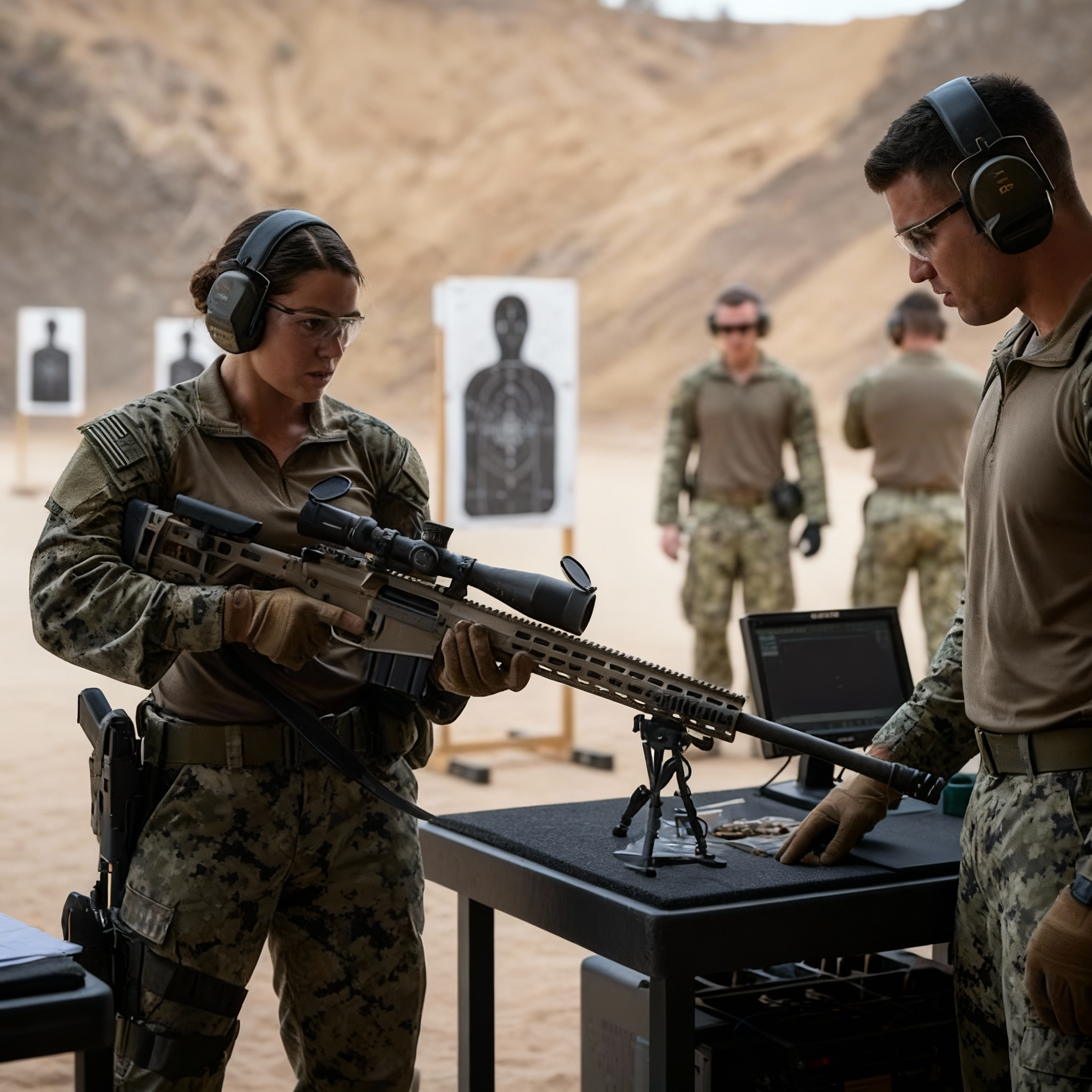 Se tiró al suelo, respirando lentamente. Viento de diez nudos, izquierda a derecha. El espejismo era pesado. Marcó, luego ajustó manualmente, ignorando el telémetro predeterminado de la mira inteligente. Objetivo: una silueta tipo E balanceándose lateralmente en cables a 1.000 yardas.