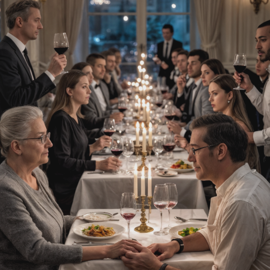 Los minutos se alargaron. El restaurante vivía, hablaba, brillaba… y, sin embargo, los ojos volvían una y otra vez hacia ella: diversión, incomodidad, compasión, curiosidad.