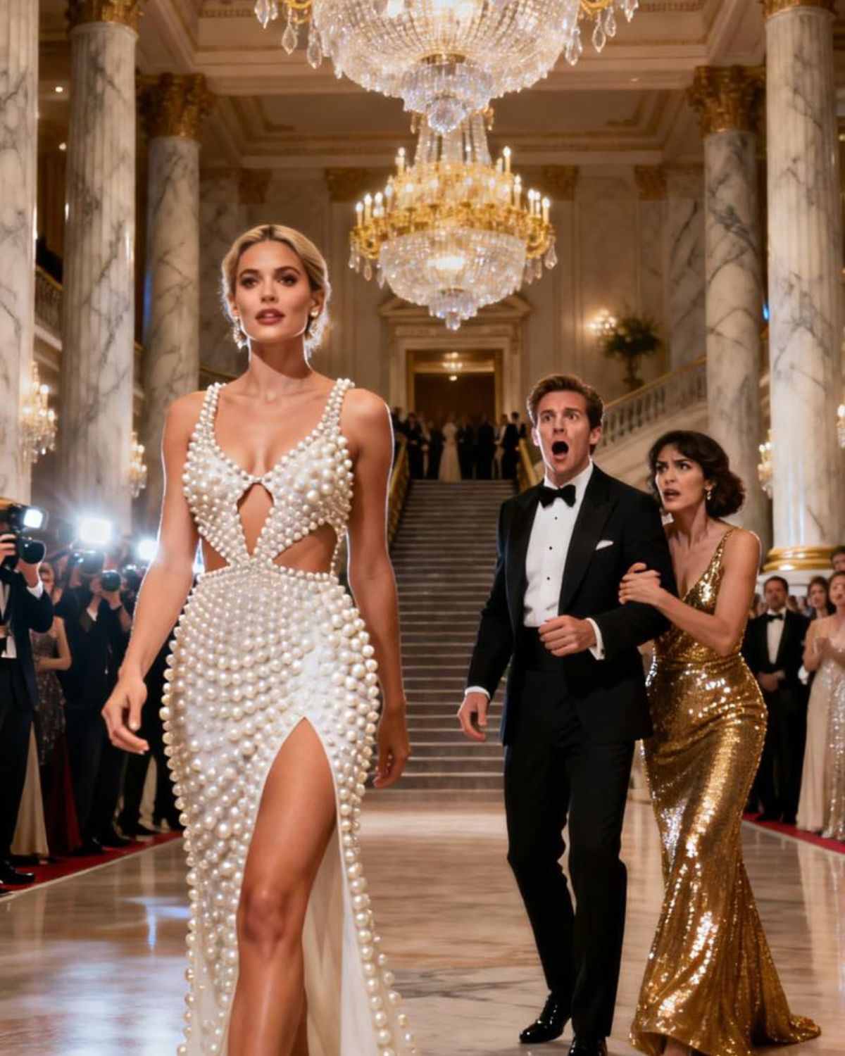 Dentro del Met, la gala estaba en pleno auge. El Gran Salón se había transformado en un templo del exceso. Orquídeas blancas caían en cascada desde los balcones; el champán corría desde fuentes de cristal. El aire olía a perfume caro y a ambición.