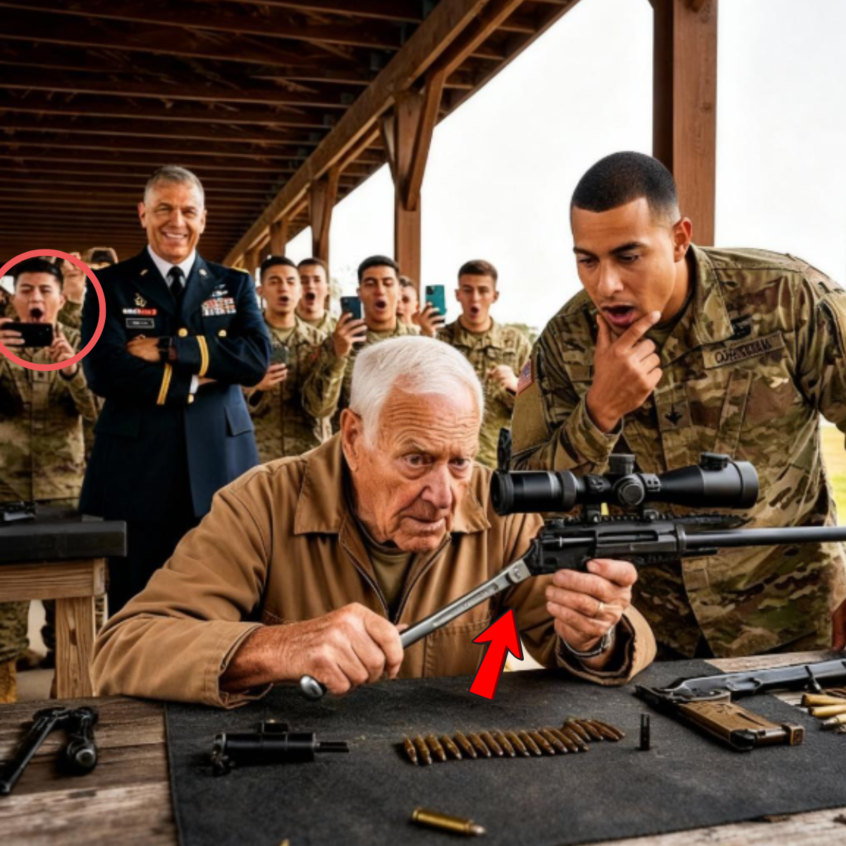Pero el teniente coronel no estaba mirando al capitán. Sus ojos recorrieron el campo de tiro hasta posarse en la figura encorvada del anciano con el mono de trabajo que estaba guardando su escoba en el cobertizo. El oficial caminó directamente hacia él, sus botas martillando el suelo con autoridad. Cuando estuvo a tres metros de distancia, se detuvo en seco.