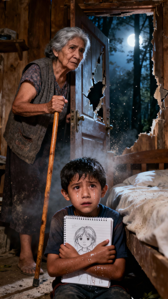 Cada golpe hacía que las bisagras chirriaran y que las tablas se astillaran. Liam, con los ojos abiertos de par en par, se apretaba contra doña Dolores, que permanecía firme, como si aquella cabaña no fuera solo madera y clavos, sino la última fortaleza de su vida. “Aparta, vieja testaruda!”, gritó Miriam desde afuera con una voz cargada de rabia. Los hombres a su lado empujaban con todo su peso y las grietas de la madera dejaban entrar destellos de la luna.