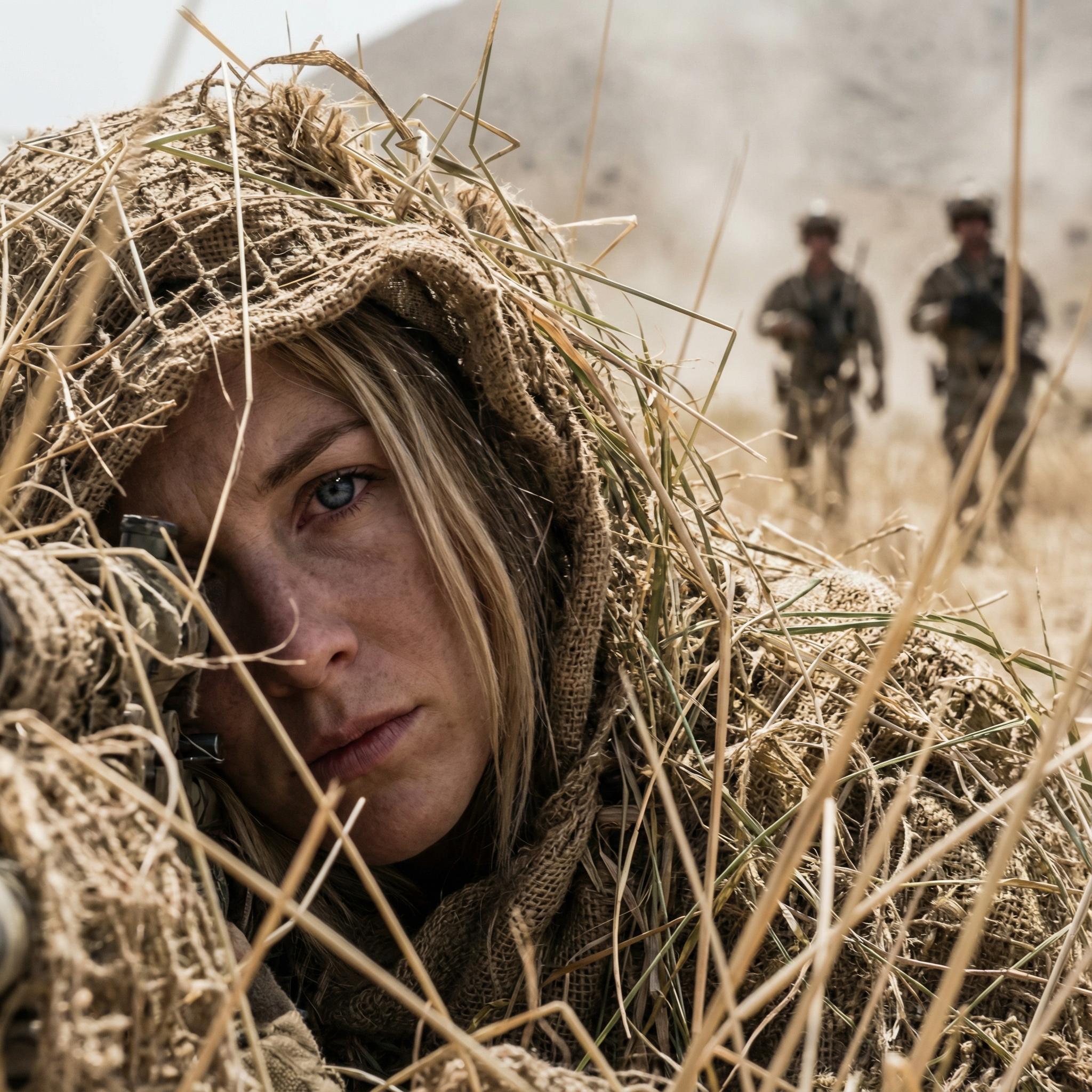 El viento se levantó, cepillando la hierba en largas pinceladas inclinadas. A medida que el patrón cambiaba, ella se movía con él, deslizándose bajo, apenas perturbando las hojas. Cada cambio de su cuerpo se mezclaba con el vaivén natural. Un acto de desaparición repetido cada pocos segundos. El Equipo Echo 7 permaneció presionado contra el suelo, contando los segundos entre sus disparos.