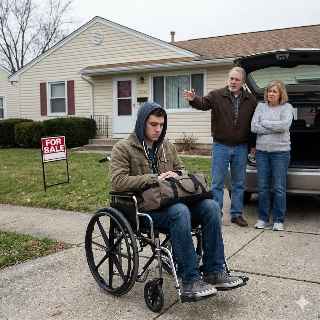 Luego la puerta se cerró. La lluvia se intensificó. Y la silla de ruedas se alejó lentamente, dejando atrás a un hijo que finalmente había encontrado su hogar, solo para ser rechazado.