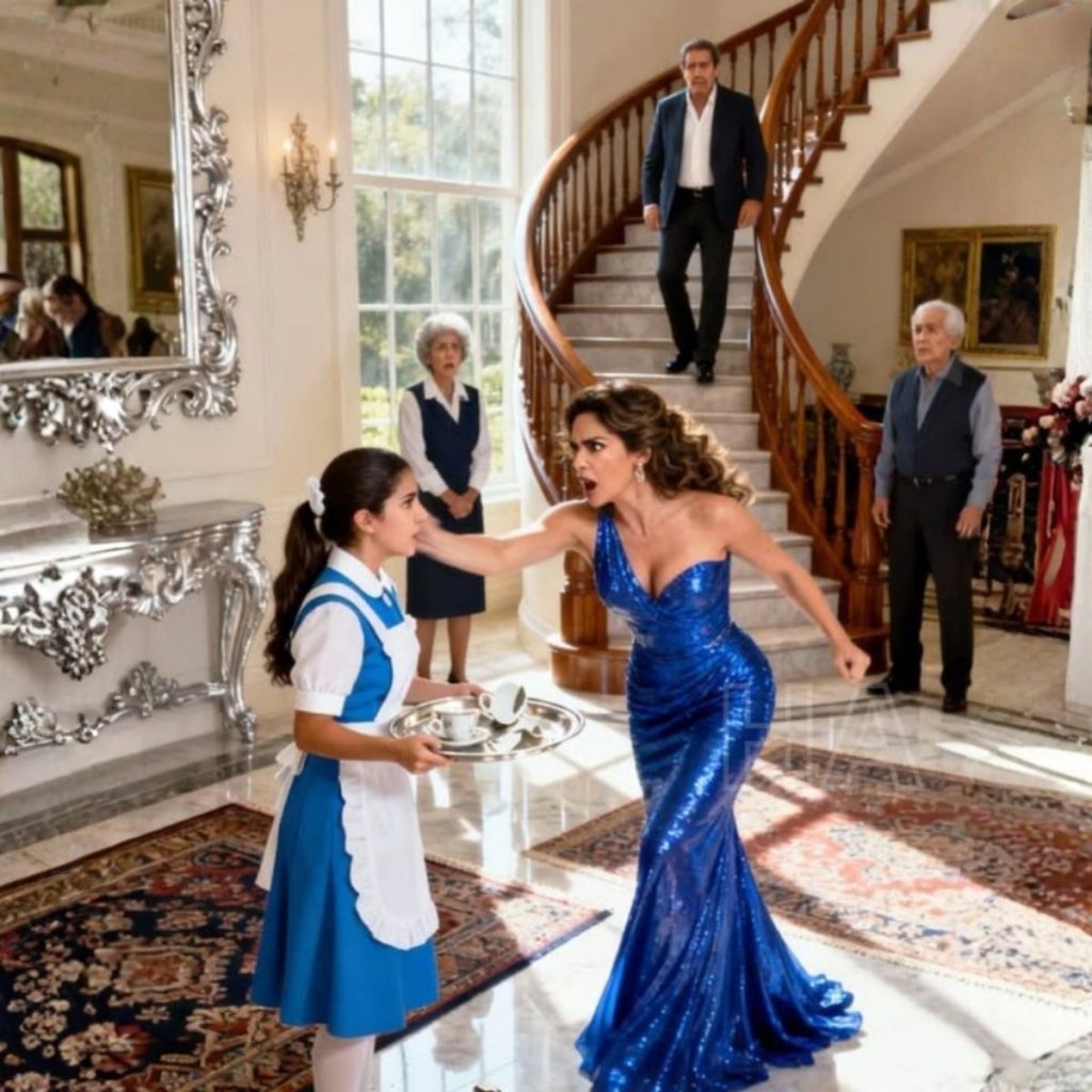 Olivia Hernández, la nueva esposa del magnate mexicano, estaba de pie con un vestido azul brillante que reflejaba la luz del sol filtrándose por los ventanales altos, los ojos encendidos de furia, y la mano aún apoyada en la mejilla de una joven criada con un uniforme impecable azul y blanco. La criada —Isabela Rivera— se estremeció, pero no se apartó.