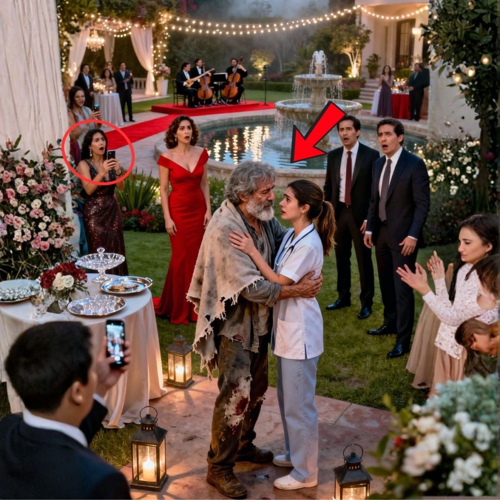 Cuando los invitados comenzaron a aglomerarse en el jardín, la música se detuvo por un segundo extraño. No porque alguien diera una orden, sino porque la escena en la reja principal parecía un error del universo: un hombre mayor, con la barba crecida y desordenada, ropa rasgada, un pantalón manchado y una manta raída sobre los hombros, caminando con una dignidad que no encajaba con su aspecto.