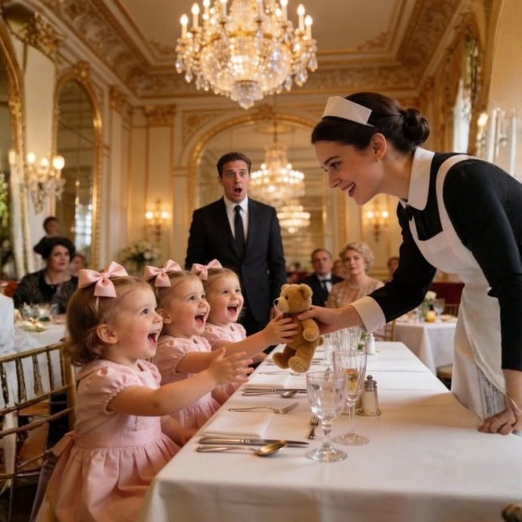 Daniel intentó calmarlas, con la voz insegura. Emily no lo pensó. Metió la mano en su delantal y sacó un pequeño osito de peluche azul con un listón rojo alrededor del cuello—algo que un cliente había olvidado semanas atrás. Se agachó a la altura de las niñas y agitó suavemente el listón como a modo de saludo.
