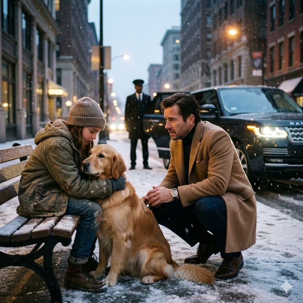 En contra de su mejor juicio, Benjamin bajó la ventanilla. Bajo un farol parpadeante, una pequeña figura estaba acurrucada contra un muro, con una manta fina sobre los hombros. A su lado, un perro negro y desgreñado temblaba en la nieve.