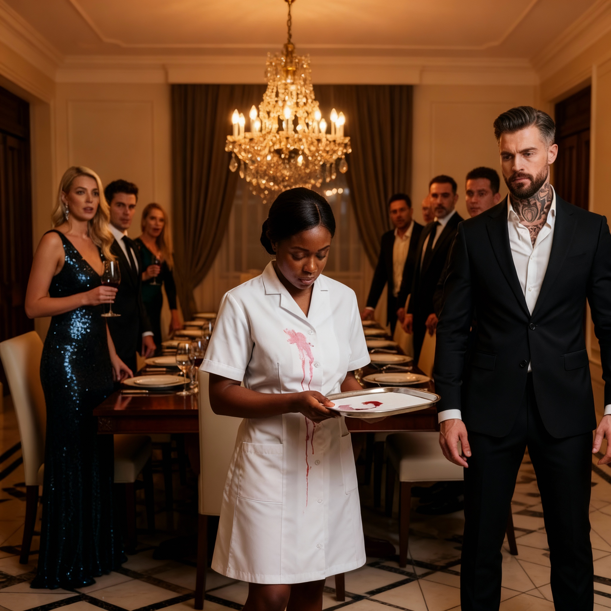 Giana alcanzó su copa de vino, y Belle lo vio venir una fracción de segundo antes de que sucediera. Vio la inclinación deliberada de la muñeca, el movimiento calculado. El vino golpeó el pecho de Belle empapando su uniforme, frío y chocante. Los jadeos resonaron a su alrededor. Alguien se rió. Belle se quedó allí, sintiendo el líquido gotear hasta sus zapatos, sintiendo cada ojo sobre ella, sintiéndose más pequeña de lo que se había sentido jamás en su vida.