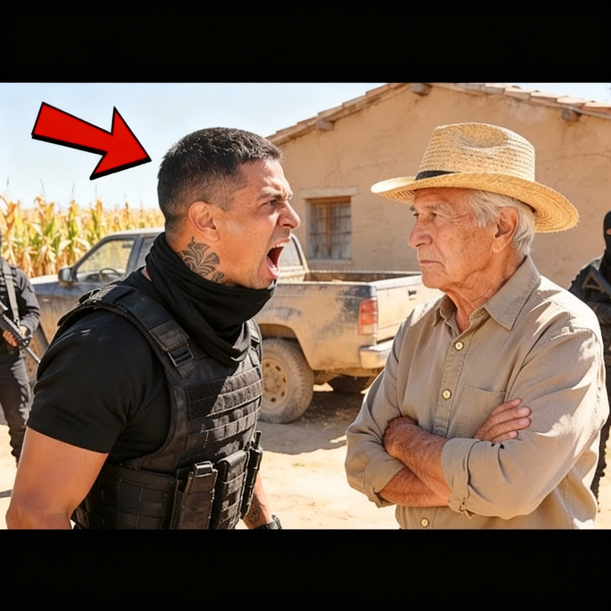 Don Aurelio sale al umbral con las manos visibles, moviéndose lentamente como corresponde a un hombre de su edad. Consuelo permanece dentro de la casa, visible a través de la ventana de la cocina, una silueta de anciana que los sicarios descartan como irrelevante. El chaparro se acerca con pasos depredadores, su mano derecha descansando casualmente sobre la pistola en su cintura. Pregunta burlonamente si el viejo ha reconsiderado la oferta. Se ha entendido que no hay negociación posible cuando el cártel quiere algo. Lo que sucede en los siguientes 7 minutos será grabado desde 18 ángulos diferentes por cámaras ocultas.