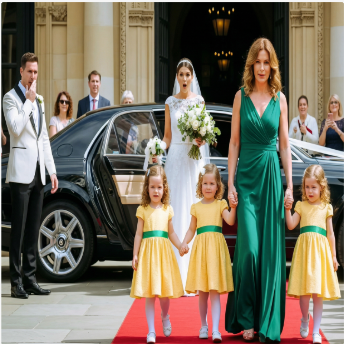 De allí salieron tres niñas vestidas con idénticos vestidos amarillos, tomadas de la mano, con sus rizos rebotando mientras caminaban con confianza por la alfombra roja. Detrás de ellas apareció Clara con un vestido verde oscuro; su figura elegante, su rostro radiante y sus ojos serenos pero firmes.