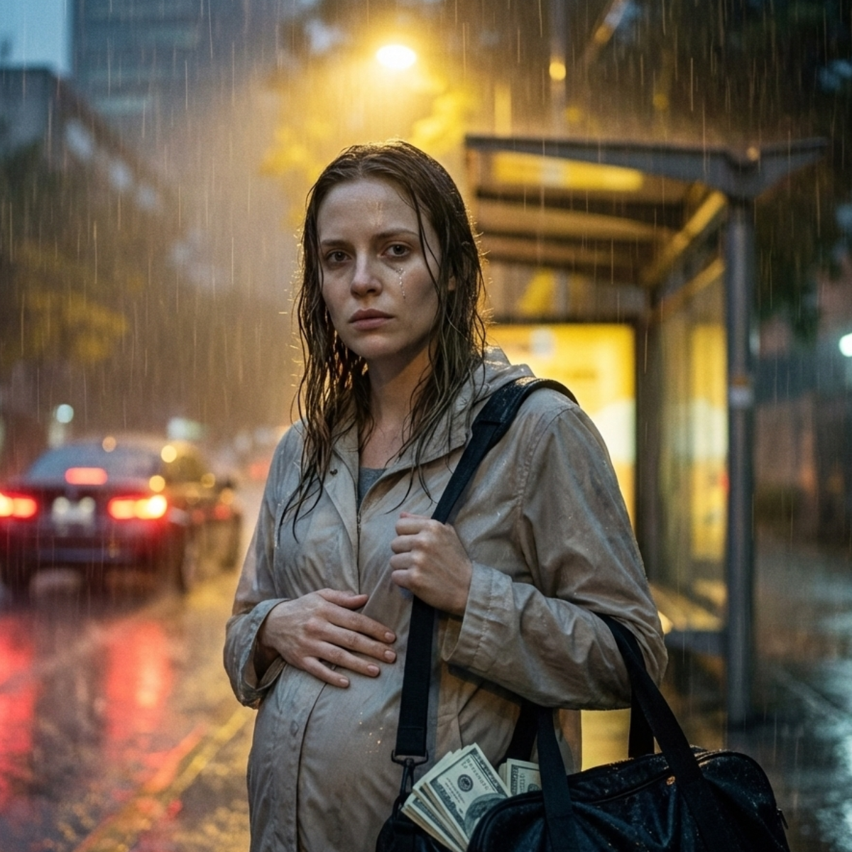 Termino sentándose bajo un parabús en la salida de la ciudad, en una avenida fría donde las luces pasaban como sombras. Emilia tiritaba, empapada, con el bebé moviéndose inquieto. Fue ahí, casi sin fuerzas, cuando vio un bulto oscuro medio escondido bajo un cartón mojado: una vieja maleta deportiva negra.