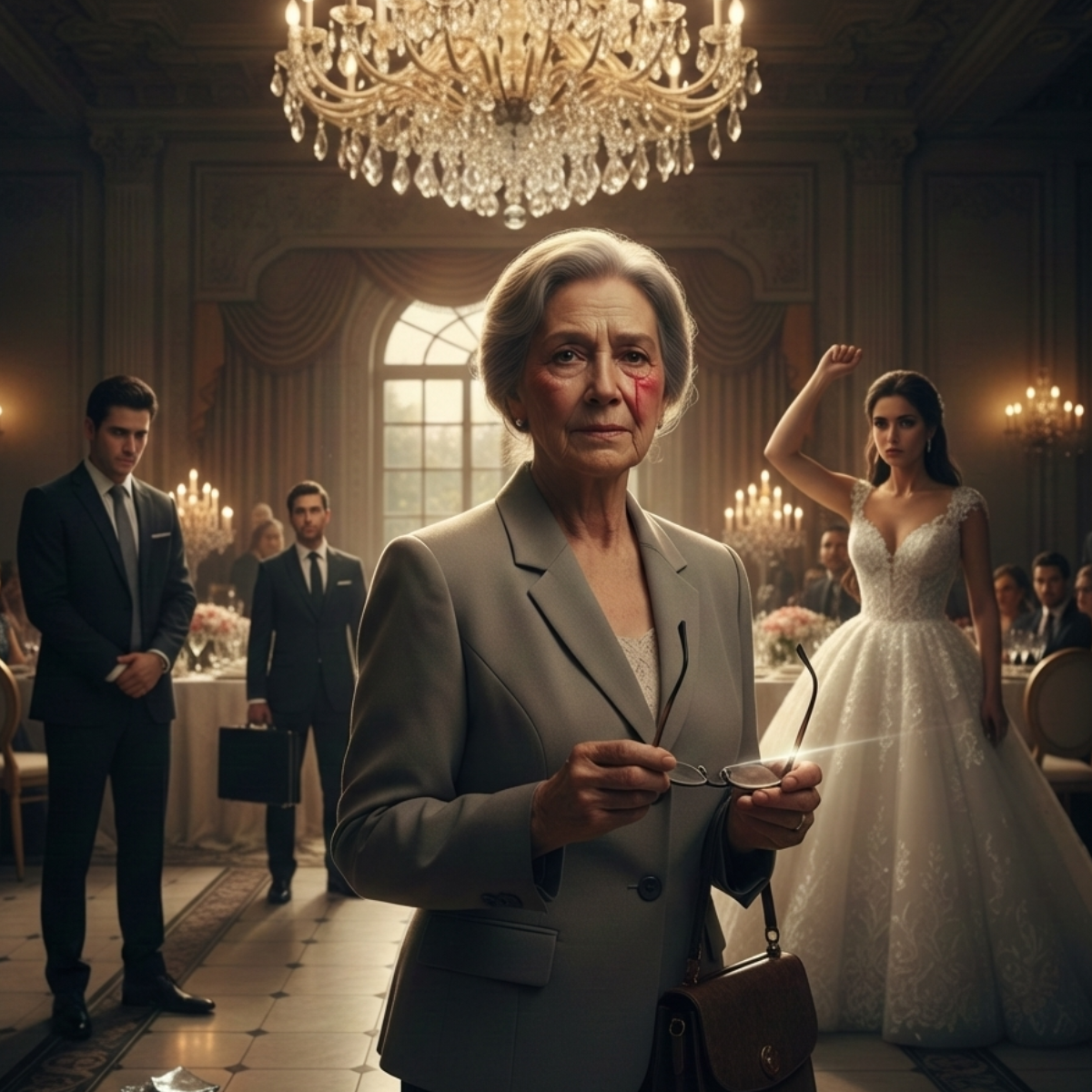 El golpe llegó tan rápido que ni siquiera alcancé a parpadear. Un segundo estaba bajo la luz cálida de la araña de cristal, tratando de entender la canción que el DJ subía de volumen, y al siguiente mi cabeza se fue hacia un lado como si me hubieran jalado el cuello. El salón se volteó. Mis lentes salieron disparados, resbalaron por el piso pulido y se rompieron con un crujido seco, como hielo delgado, justo frente a los zapatos impecables de ciento treinta invitados que se quedaron mudos.