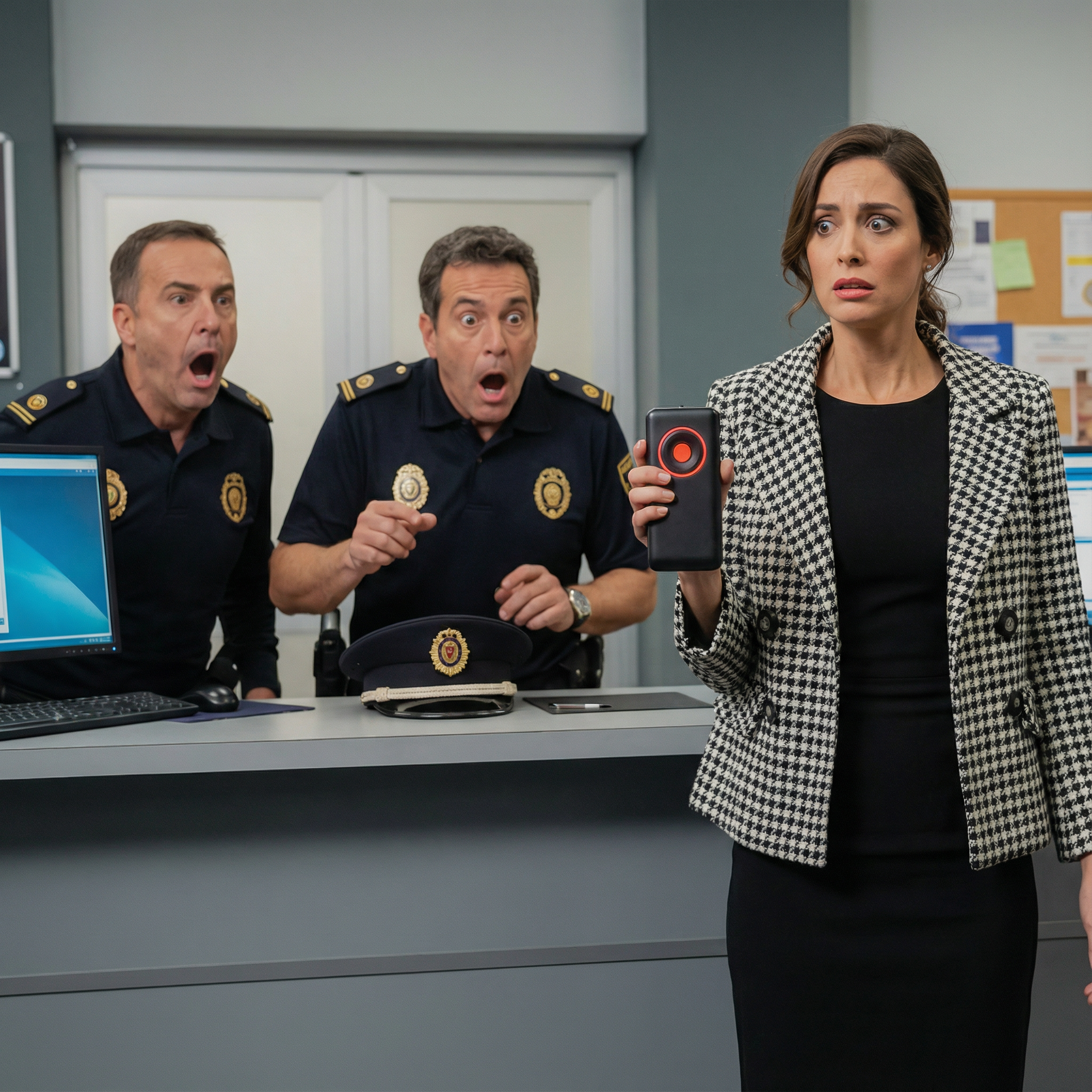 Su rostro, antes sereno, se tensó en cuestión de segundos. Ordenó inmediatamente al joven agente que retrocediera y se alejara del mostrador. El inspector Montoya se acercó lentamente, observando el patrón de parpadeo de la luz y los finos cables visibles en las rendijas de la caja. Sin tocarla, la atmósfera en la sala cambió drásticamente, volviéndose opresiva.