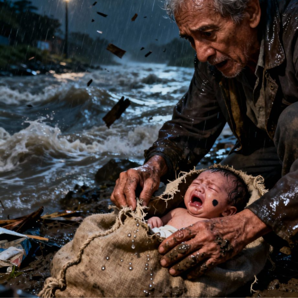 Un anciano pepenador llamado Don Hilario pasó por ahí buscando chatarra y madera arrastrada por la corriente. Entre el ruido de la lluvia, escuchó un llanto débil. Corrió, abrió el costal y encontró a la niña.