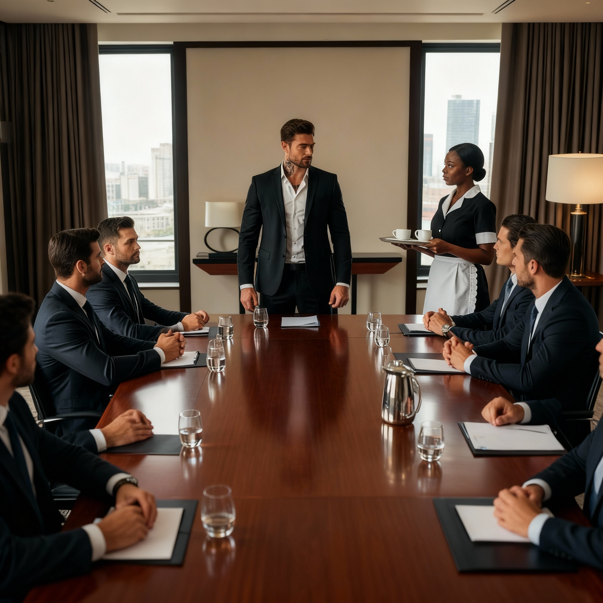 Acababa de terminar de colocar el servicio de café cuando las puertas se abrieron. Antonio Valentini entró primero. A Monique se le cortó la respiración a pesar de sí misma. Nunca había estado tan cerca de él antes. Era alto, al menos 6’3, con hombros anchos que llenaban su traje carbón perfectamente. Su cabello negro estaba peinado hacia atrás, revelando un rostro que pertenecía a pinturas del Renacimiento italiano. Mandíbula fuerte, nariz romana, labios que parecían crueles hasta que notabas las líneas de risa en las esquinas. Un tatuaje asomaba por encima de su cuello, una escritura elegante en italiano que no podía leer del todo.