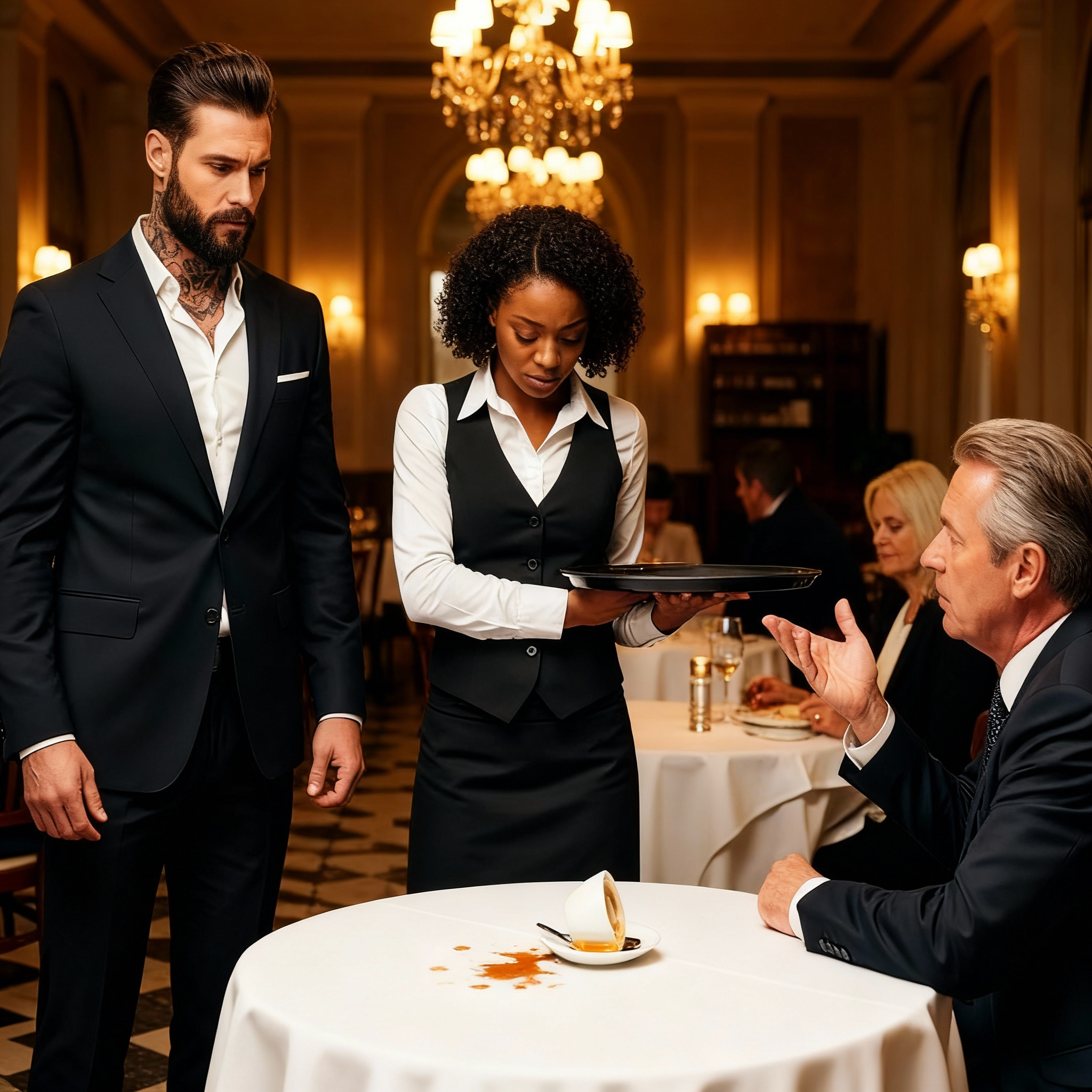 Luna hizo todo lo que él pidió, moviéndose rápidamente entre las mesas, equilibrando bandejas, sonriendo cuando quería gritar. Fue entonces cuando todo se desmoronó. Estaba sirviendo café a Blackwood cuando él extendió repentinamente el brazo para agarrar su teléfono, golpeando la mano de ella. El café se derramó, manchando la manga de su costosa camisa.
