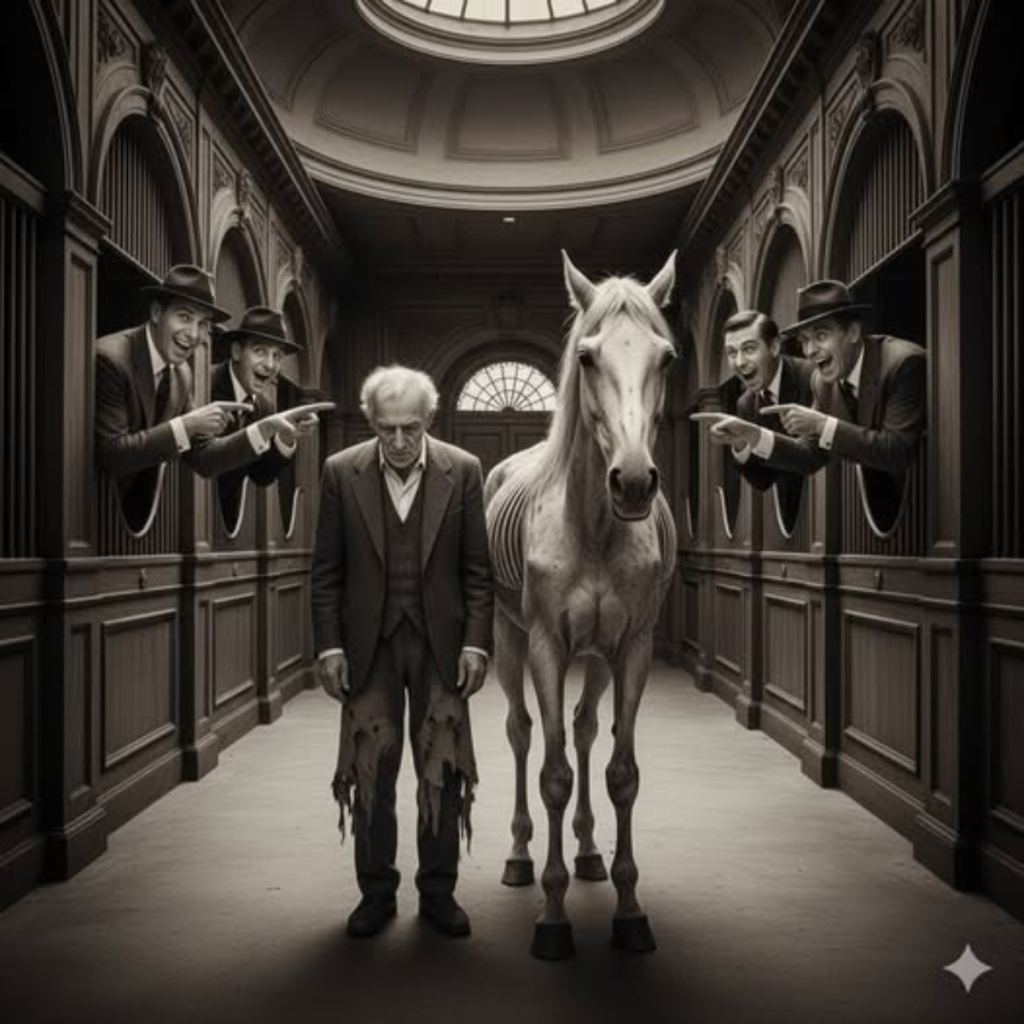 Teodoro se acercó. Extendió la mano, temblándole, y rozó el lomo. El caballo soltó un resoplido débil y giró la cabeza, como si ya supiera que todo era burla.