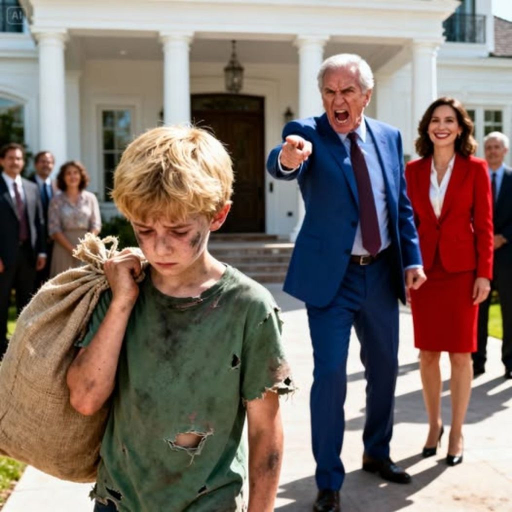 Cincuenta invitados adinerados observaban, horrorizados, mientras un niño de doce años, cubierto de lodo, era arrastrado hacia la entrada de la mansión. El millonario lo señalaba como si fuera basura, y la risa cruel de su familia retumbaba en las paredes de mármol. Lo que ninguno de ellos sabía era que, en exactamente cuatro minutos, una sola palabra transformaría su noche perfecta en una pesadilla que nadie jamás olvidaría.