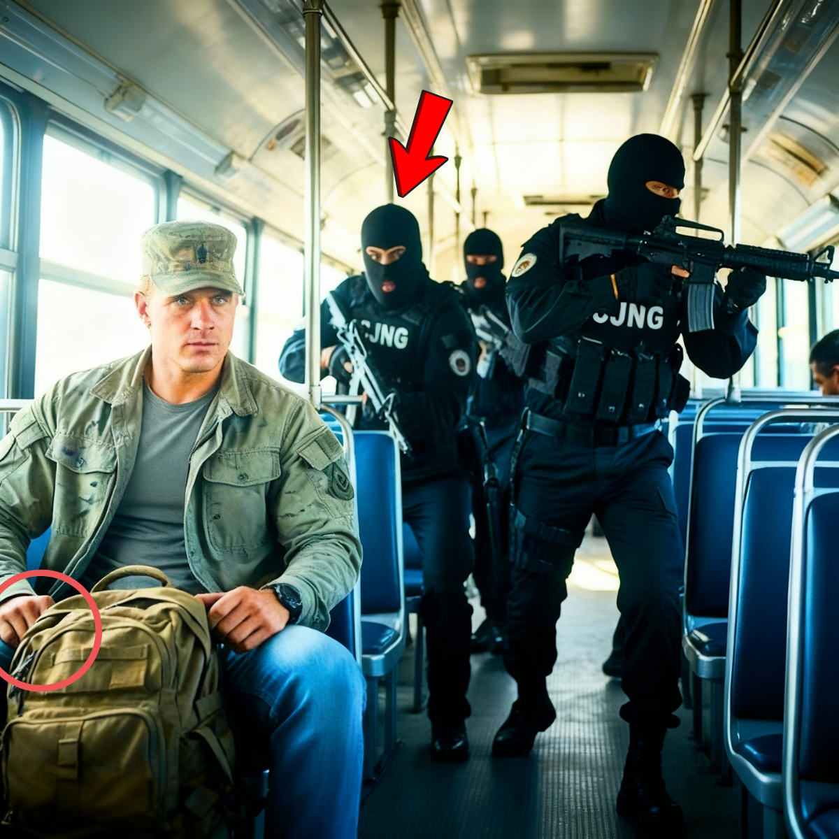 Adrián abrió los ojos cuando sintió el frenazo. Su cerebro militar se activó instantáneamente. Evaluó la situación en 3 segundos: camionetas bloqueando, hombres armados aproximándose, pasajeros comenzando a gritar, niños llorando, el conductor paralizado.