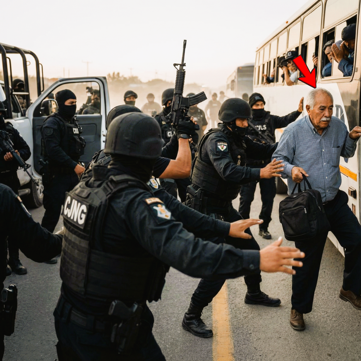 Los sicarios se acercaron al autobús. Cinco de ellos avanzaron, mientras los demás quedaron en posiciones estratégicas alrededor de las camionetas. Uno golpeó la puerta con la culata de su rifle.