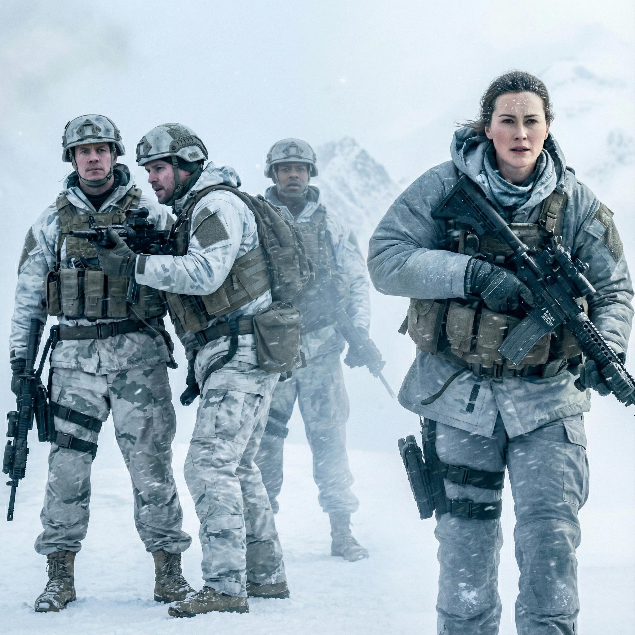 El pelotón se movió de la manera en que habían sido entrenados: espaciamiento medido en pasos que apenas podían ver. Cada hombre confiando en la forma del que iba adelante. La nieve se acumulaba en cuellos y guantes. El viento destrozaba el equilibrio. Cada sonido se sentía amplificado y sin sentido al mismo tiempo.