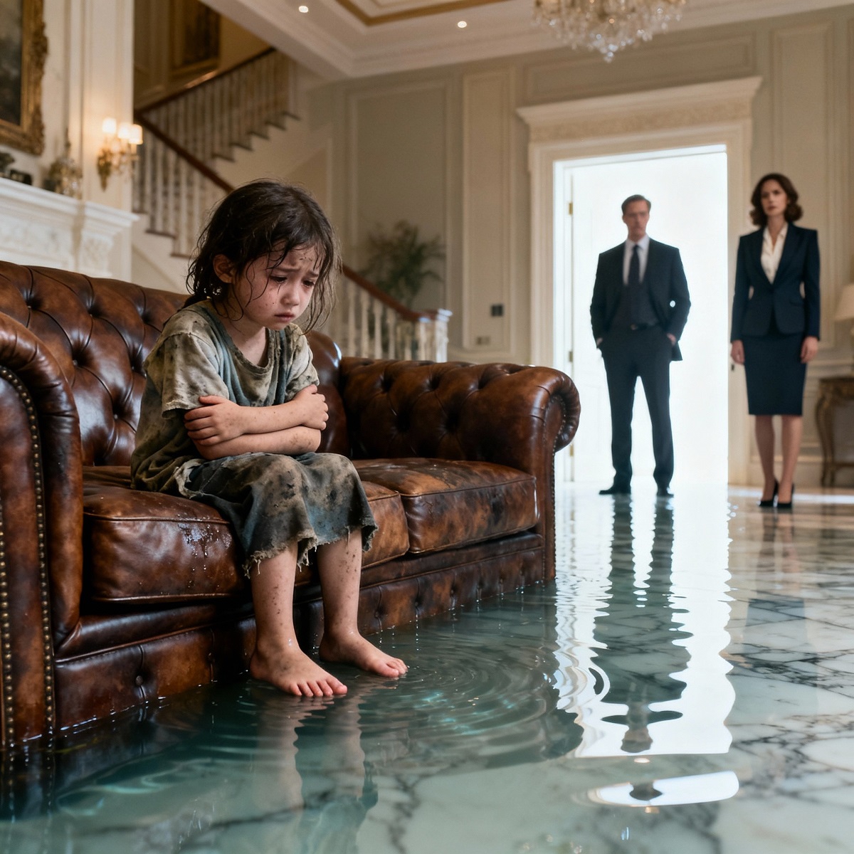 La niña estaba acurrucada en posición fetal sobre el sofá de cuero. El uniforme azul marino chorreaba. El agua goteaba al piso formando un charco. El cabello largo, pegado a una cara pálida como papel. Los labios… azules. Los ojos, medio cerrados, vidriosos. El cuerpo entero temblando con una violencia que no parecía humana.