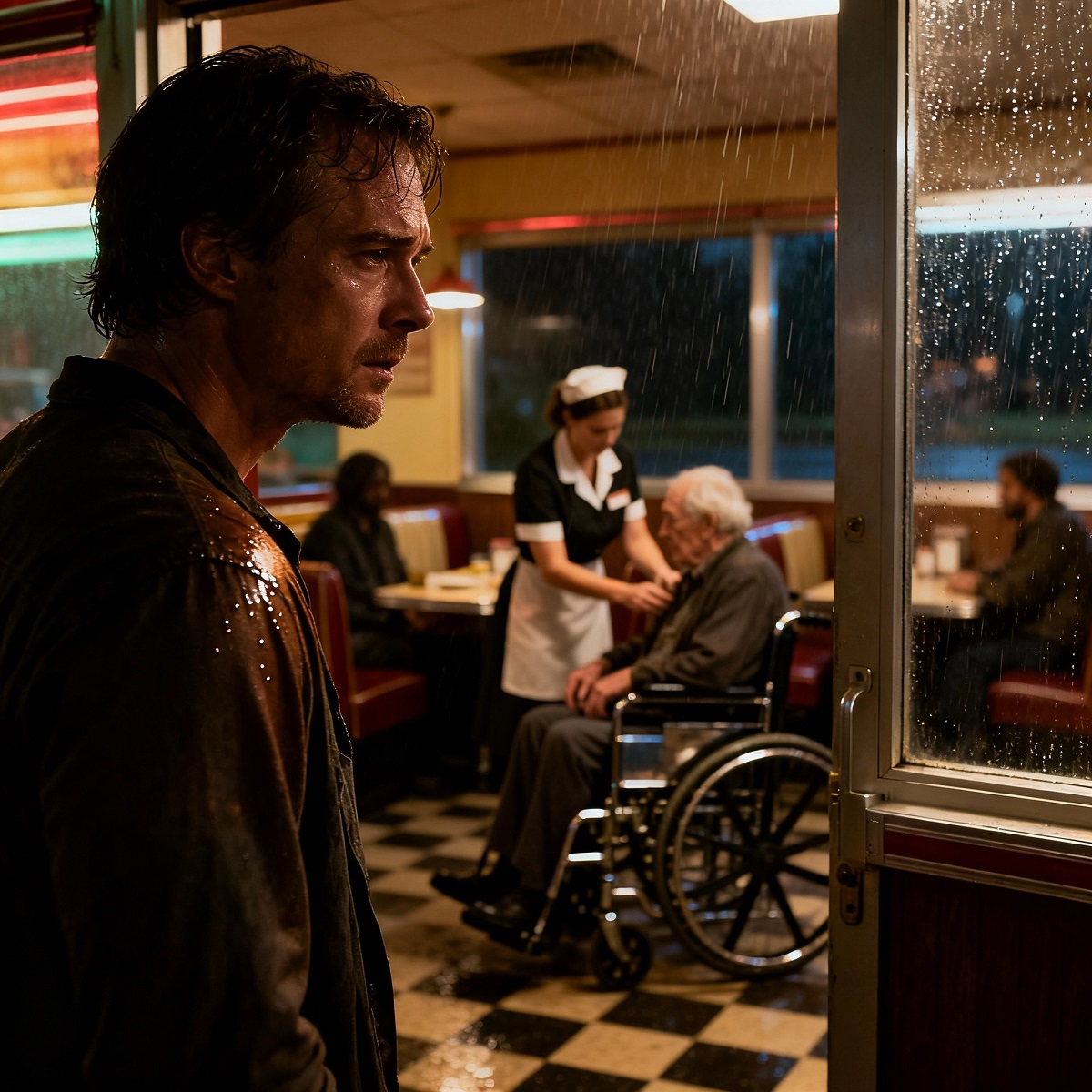 Empujó con todas sus fuerzas, luchando contra el pavimento resbaloso y las ruedas pesadas, metiéndolo en el calor del diner como si lo estuviera arrancando del borde de algo mucho más oscuro que la lluvia.
