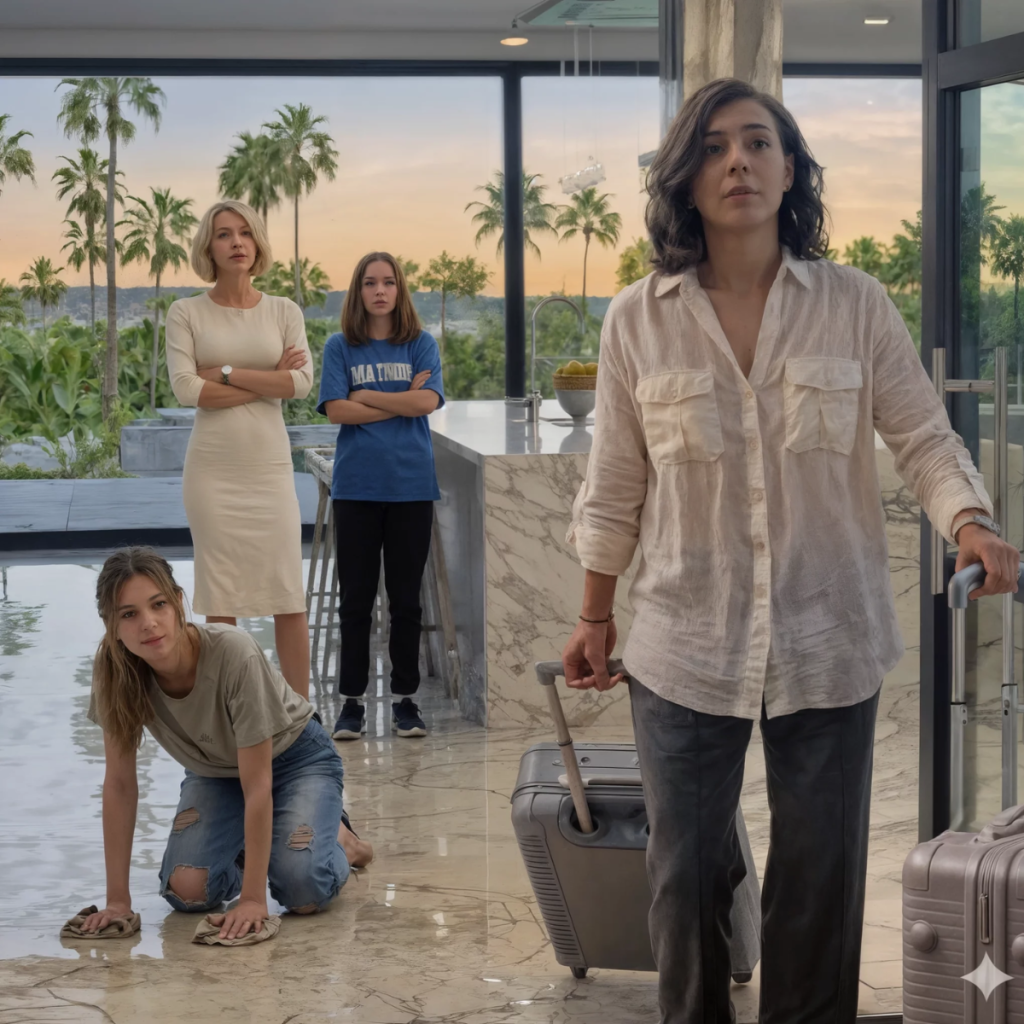 Entré arrastrando mi maleta más allá del umbral. El silencio en el interior tenía algo extraño: no era paz, era opresión, como el aire de una habitación donde acaba de haber una pelea violenta. Seguí el sonido del agua corriendo, luego una voz dura que resonaba sobre las superficies lisas. Venía de la cocina.