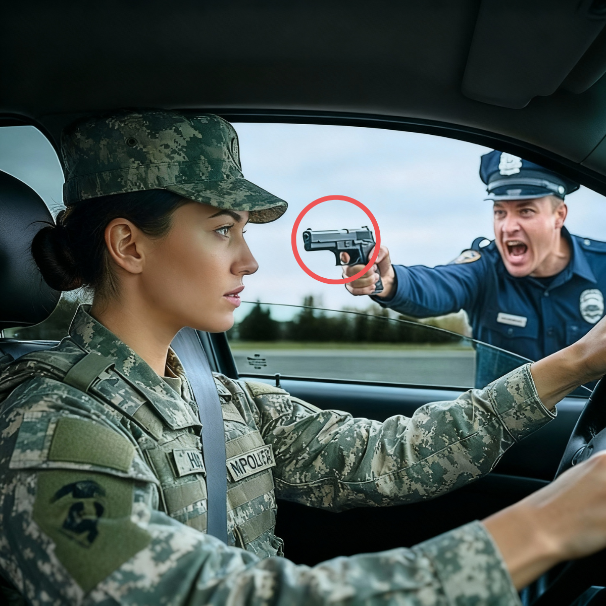 Dentro del vehículo, Mariana Ramírez no se movió. Su respiración era calma. Sus manos seguían firmes sobre el volante y esa quietud parecía irritar aún más a la gente que la apuntaba. El gatillo, tenso bajo el dedo del oficial, podía cambiarlo todo en un instante.