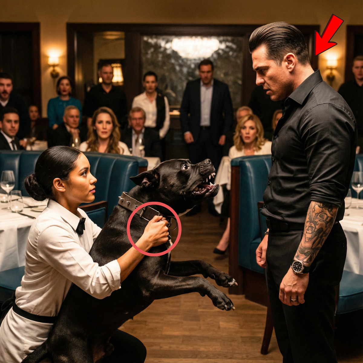 Titán estalló. El rugido del pitbull fue primitivo, un sonido que pertenecía a un foso de pelea, no a un restaurante. La pesada cadena que lo aseguraba a la pata de la mesa se rompió. Realmente se rompió. Y luego, 65 kilos de músculo y furia estuvieron en el aire, lanzándose hacia Gallow con una violencia decidida.