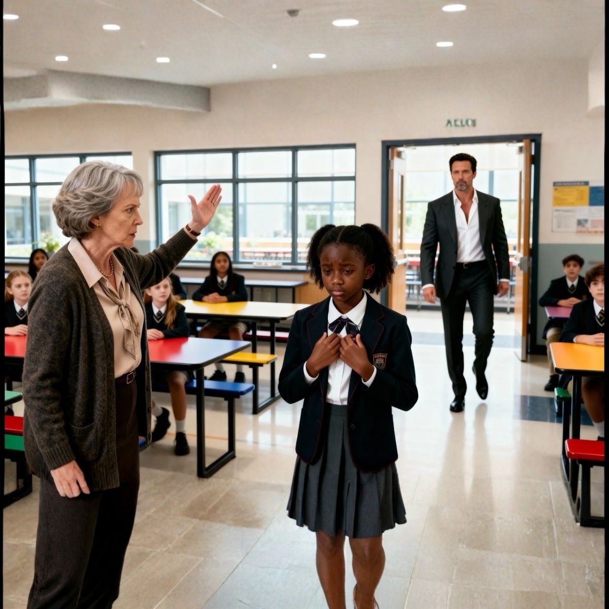Immani—ocho años, trenzas perfectas, uniforme impecable—estaba sola en la fila, sujetando su bandeja con tanta fuerza que los nudillos se le ponían pálidos.
