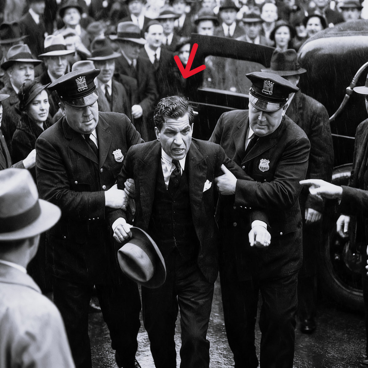 El funeral de la madre de Luciano. 1,000 personas están de luto. El detective Harrian caminó entre la multitud. Las cámaras de televisión lo seguían. Esposó a Lucky justo ahí, al borde de la tumba, todo por publicidad. El arresto se convirtió en un titular.