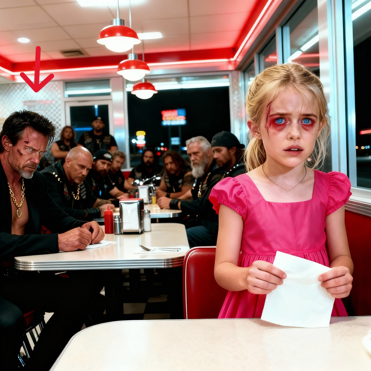 Levantó la vista. Al otro lado de la sala, una niña pequeña estaba paralizada junto a su madre. Sus labios temblaban, sus ojos suplicaban, su pequeña mano todavía medio oculta detrás de su vestido, como si no estuviera segura de que el mensaje hubiera llegado a la persona correcta. Detrás de ella, un hombre con una chaqueta de cuero apretó su agarre sobre el hombro de la niña. Demasiado fuerte, posesivo, peligroso. El camarero pasó justo por delante de ella, perdiéndose por completo el miedo tallado en sus ojos.