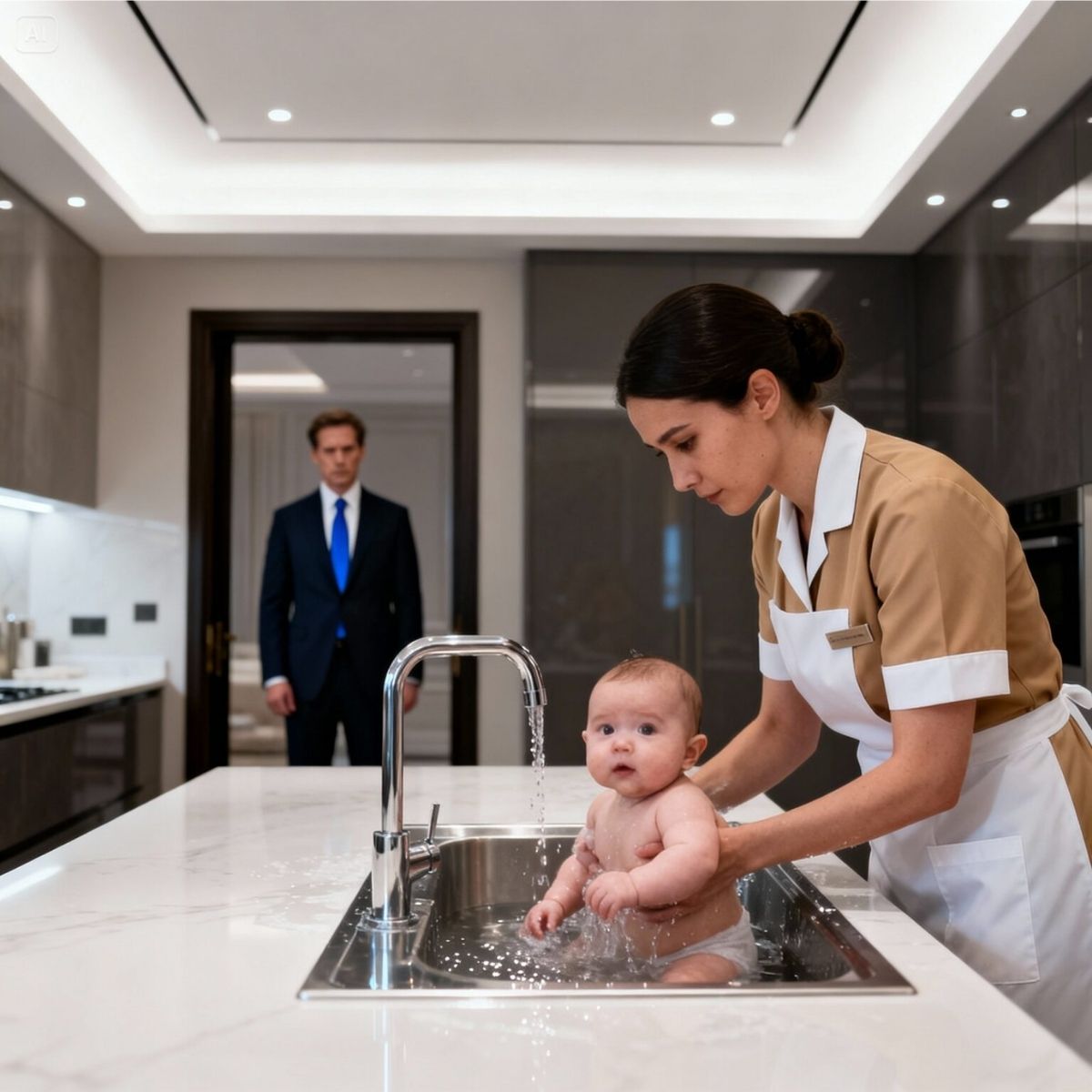 SIN NIÑERA… LA LIMPIADORA BAÑÓ AL BEBÉ EN EL FREGADERO… PERO CUANDO EL PADRE BILLONARIO LO VIO…