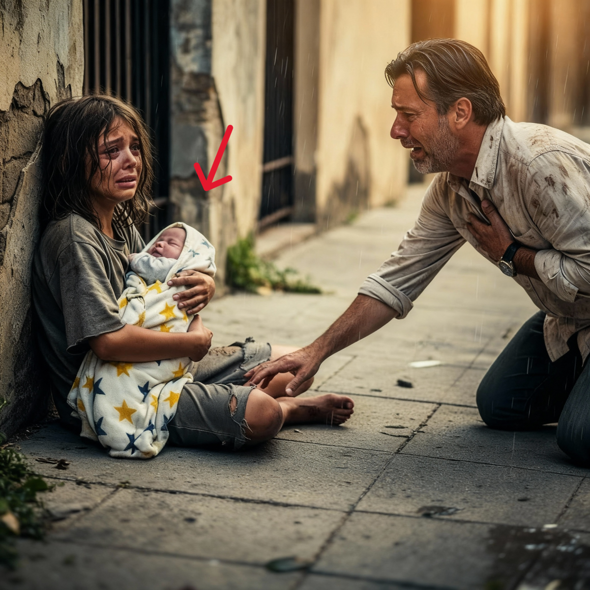 La mujer bajó lentamente la escoba, como si los movimientos bruscos pudieran romper algo. Miró el bulto en los brazos de Sofía, los pies descalzos de la niña, su cara marcada por la suciedad y las lágrimas secas. Luego suspiró de una manera que parecía cargar el peso de muchas historias similares.