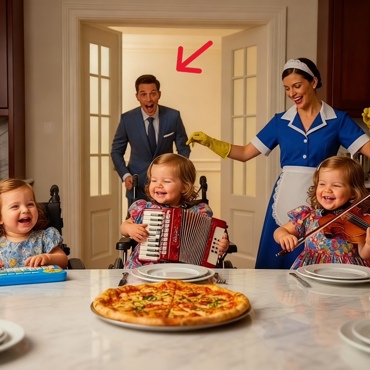El millonario llegó a casa temprano esperando encontrar el silencio habitual, pero lo que vio le detuvo el corazón. Las tres hijas, que llevaban meses paralizadas, tocaban instrumentos en medio de la cocina: una con el violín, otra con el acordeón y otra con el teclado. Se reían genuinamente mientras la empleada bailaba y una pizza gigante estaba en la mesa. Eso era imposible, eso no podía estar pasando. Y lo que descubriría a continuación revelaría algo cruel que había estado sucediendo durante mucho tiempo y cambiaría la vida de todos allí para siempre.
