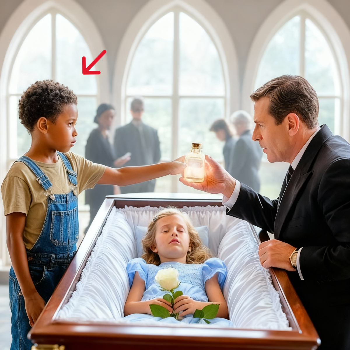 En el velorio, entre flores y llanto, el padre millonario contemplaba el cuerpo de su hija, muerta tras ahogarse accidentalmente en la piscina de la mansión. Fue entonces cuando un niño apareció repentinamente, ofreciéndole un frasco con un líquido dorado y diciendo con calma: