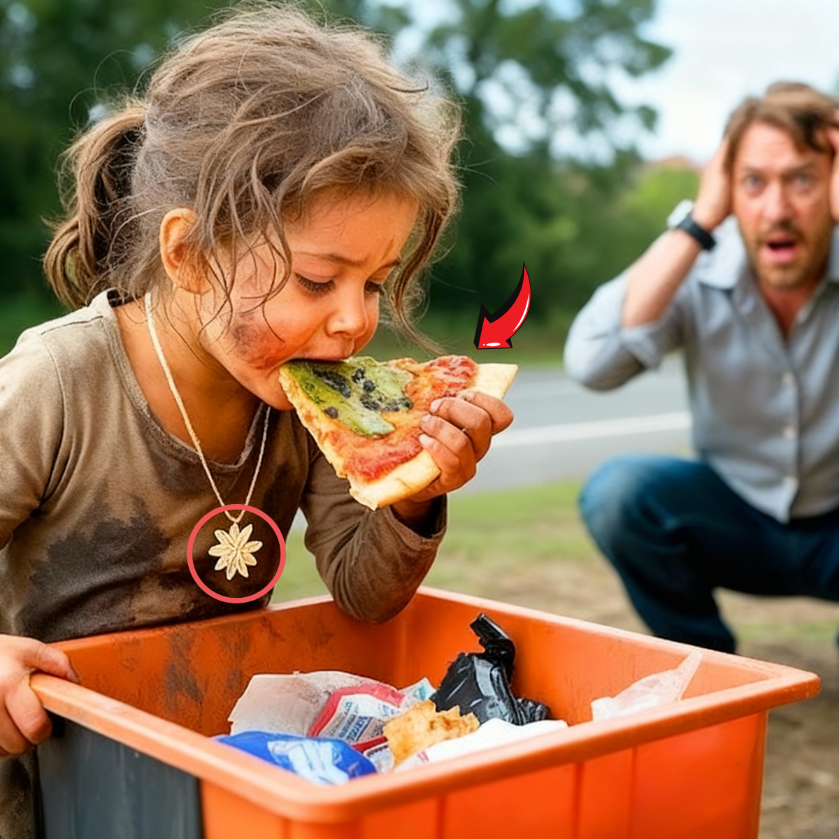 El millonario se detuvo al ver a la niña comiendo un trozo de pizza mohosa, como si eso fuera todo lo que tenía. Se arrodilló para ayudarla, pensando que era solo otra vida perdida en el mundo. Pero en el instante en que ella giró el cuello, algo brilló a la luz del día.
