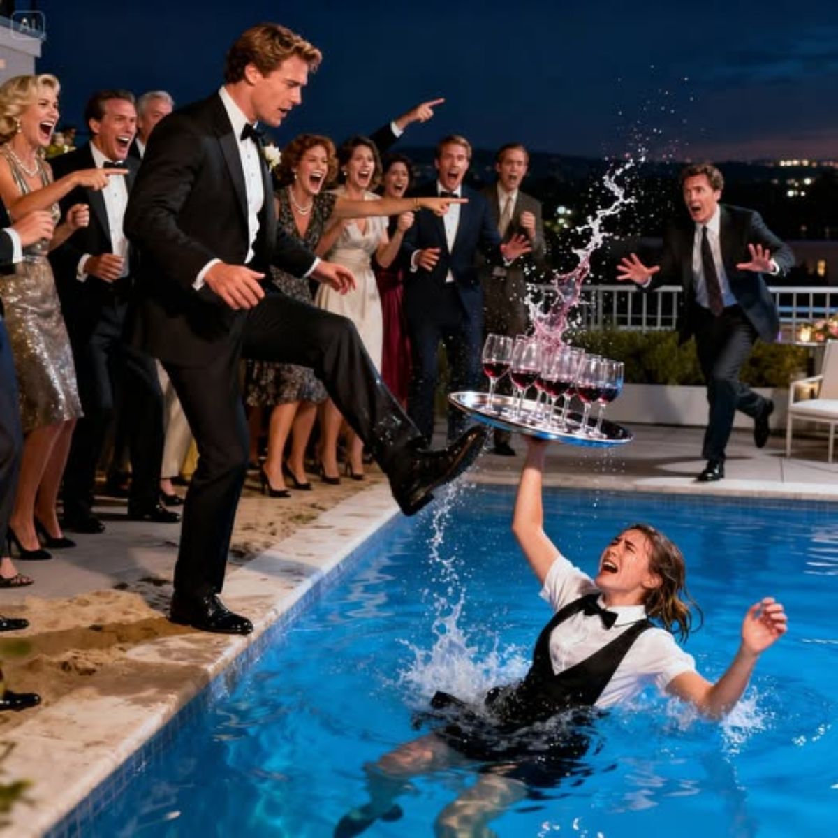En medio de la ruidosa fiesta, la mesera pobre se tambaleó bajo una bandeja llena de vasos. Un grupo de invitados se rió de ella y la empujó; ella cayó directo a la piscina mientras estallaban las carcajadas por todas partes. Salió del agua como pudo, empapada y temblando, mientras la multitud seguía burlándose de ella. En ese momento, entró un hombre con traje. Todas las risas murieron al instante cuando habló: “Todos ustedes… acaban de perder su contrato conmigo”. El ambiente se congeló en el acto.