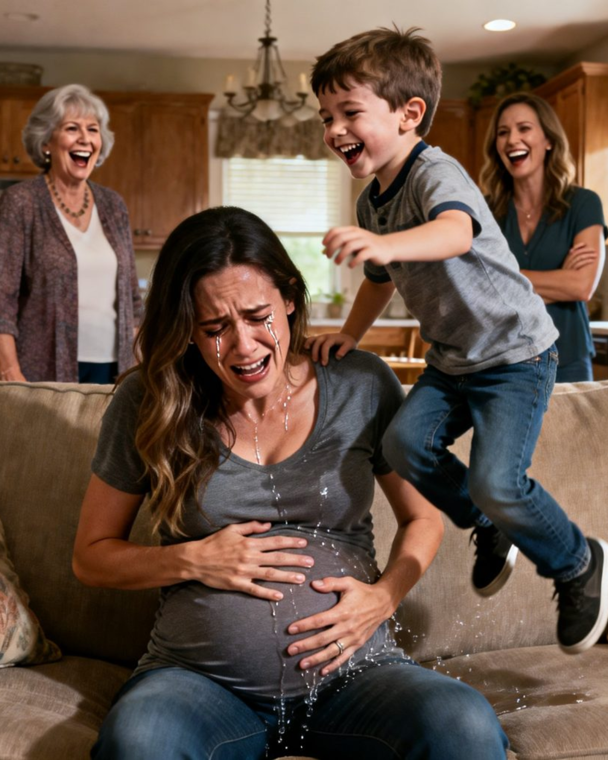 Mi sobrino de seis años saltó sobre mi barriga, riéndose y gritando: «¡Sal, bebé! ¡Rápido!». Un dolor agudo me atravesó de inmediato y, en ese instante, se me rompió la fuente. Al ver eso, mi suegra y mi cuñada estallaron en carcajadas. Desesperada, agarré el teléfono para llamar a mi marido. Pero al segundo siguiente, ocurrió algo terrible.