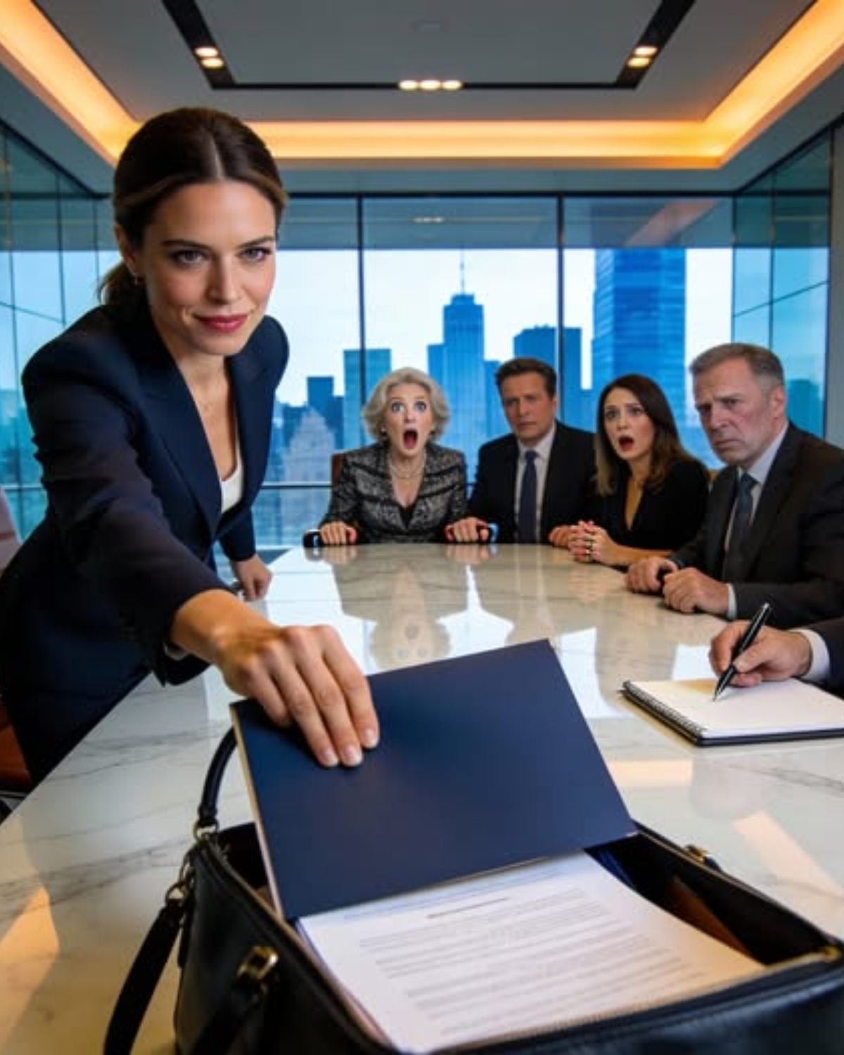 La familia de mi esposo convocó una “reunión privada”. Cuando llegué, me entregaron los papeles del divorcio y me dijeron: “Firma, o te vas para siempre”. Yo sonreí, saqué mi propia carpeta y dije: “Qué curioso, porque yo también traje algo”. Mi esposo palideció cuando vio la primera página.